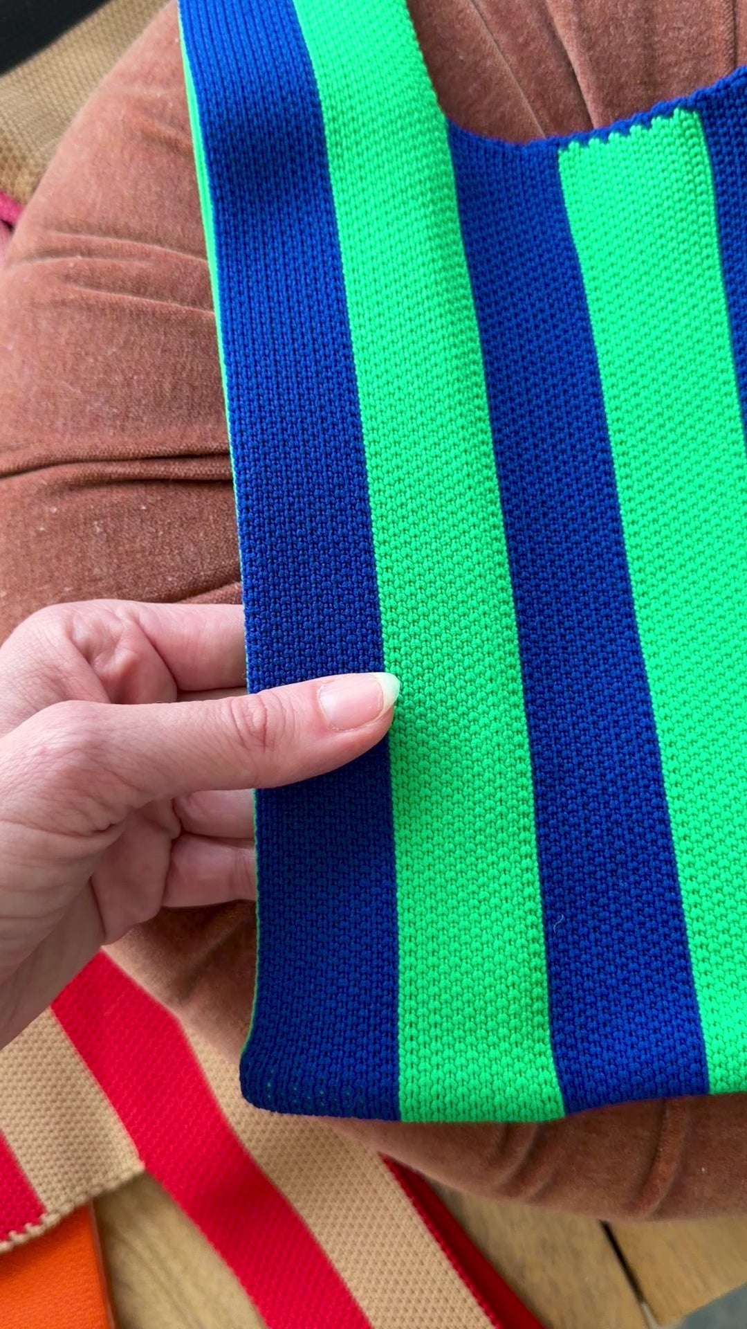 *Our Y Knot tote bags have the same soft, stretchy feel as the Y Knot wrist bags, with a lighter, wool-like texture made for the holidays. The shape is similar, but the longer handles make it an easy, cozy carry for everyday errands, gifts, and winter layers.