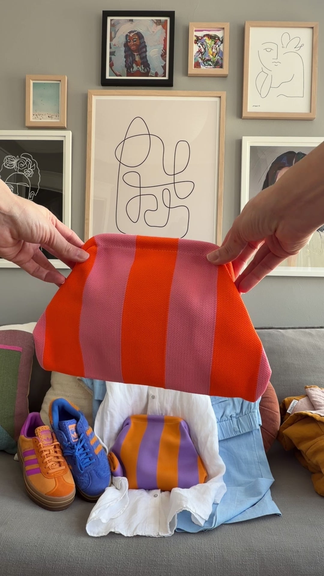 Cream with a soft orange accent, bright in a gentle way. Warm, playful, and fresh. Like a small spark of morning brightness tucked under your arm. A happy piece that still feels wearable with everything.